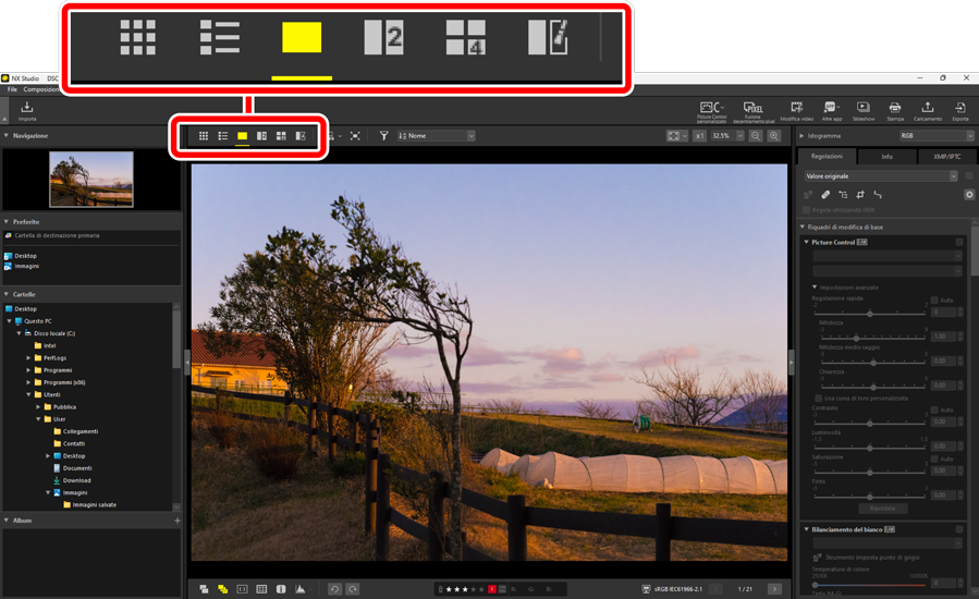 Scegliere una modalità di visualizzazione nella barra strumenti in alto.