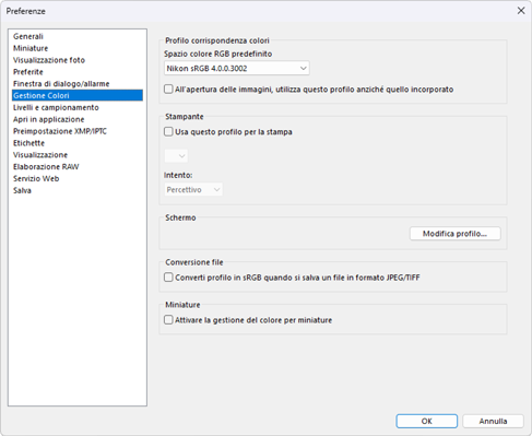 - Selezionare [Converti profilo in sRGB quando si salva un file in formato JPEG/TIFF] per incorporare il profilo colore sRGB in immagini convertite in altri formati durante l'esportazione. Il profilo colore originale viene sovrascritto.