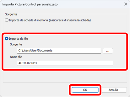 Nella finestra di dialogo [Importa Picture Control personalizzato], selezionare [Importa da file], scegliere un file da importare e fare clic su [OK].