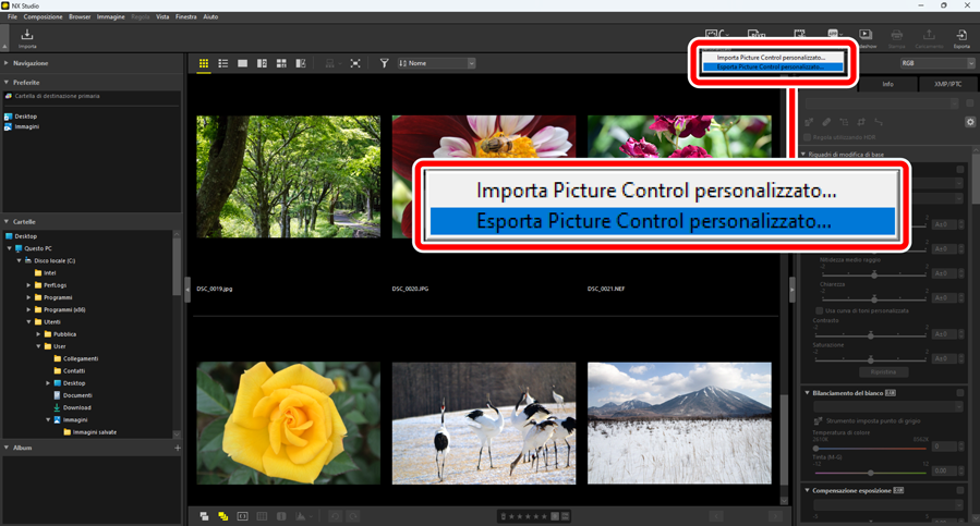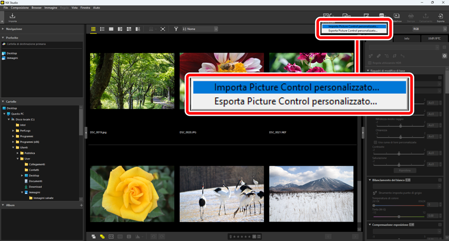 I file Picture Control personalizzato creati con fotocamere e software compatibili possono essere salvati importandoli in NX Studio.