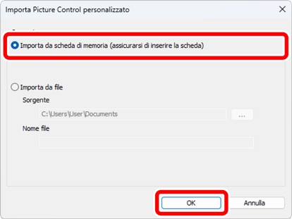 Nella finestra di dialogo [Importa Picture Control personalizzato], scegliere [Importa da scheda di memoria (assicurarsi di inserire la scheda)] e fare clic su [OK].