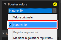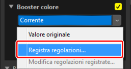 Le impostazioni correnti possono essere aggiunte ai menu in ciascuno strumento. Le impostazioni possono quindi essere selezionate dal menu e applicate ad altre immagini. Il testo che segue utilizza lo strumento [Booster colore] a scopo illustrativo.
