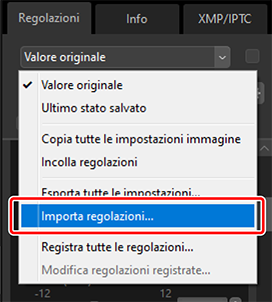 Selezionare [Importa regolazioni] nel manager regolazioni, scegliere il file creato allo step 2, quindi fare clic su [Apri] per applicare le regolazioni scelte a tutte le immagini della selezione attuale.