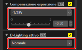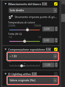 Le regolazioni vengono applicate alle immagini selezionate. [Compensazione esposizione] cambia al valore selezionato nello step 1 mentre [D-Lighting attivo] ritorna a [Valore originale (No)].