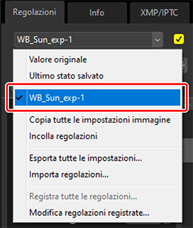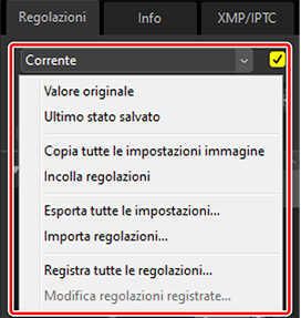 Lo strumento manager regolazioni nella scheda regolazioni può essere utilizzato per copiare o salvare le regolazioni e applicarle ad altre immagini. Più regolazioni possono essere applicate contemporaneamente (0 Applicazione simultanea di regolazioni a più immagini).