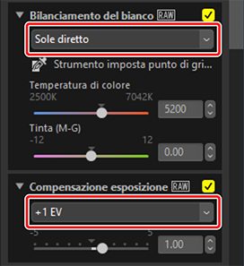 Regolare le impostazioni nella tavolozza regolazioni. Qui abbiamo impostato [Bilanciamento del bianco] su [Sole diretto] e [Compensazione esposizione] su [+1 EV].