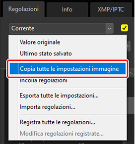 Copiare le regolazioni da un'immagine all'altra o salvare le impostazioni correnti per l'uso successivo.