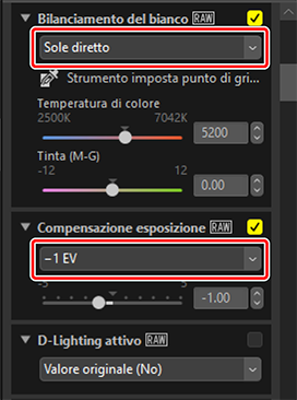 Regolare le impostazioni nella tavolozza regolazioni. Qui abbiamo impostato [Bilanciamento del bianco] su [Sole diretto] e [Compensazione esposizione] su [−1 EV].