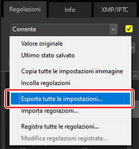 Utilizzare [Esporta tutte le impostazioni] per esportare tutte le regolazioni a un file di regolazioni. Il file può quindi essere caricato e applicato alle immagini della selezione attuale utilizzando [Importa regolazioni]. I file di regolazione possono anche essere copiati per l’utilizzo su altri computer.