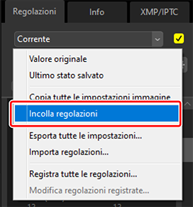 Selezionare [Incolla regolazioni] nel manager delle regolazioni.