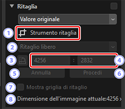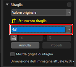 - Le dimensioni del ritaglio corrente. Per immettere le dimensioni direttamente nelle caselle di testo, selezionare [Personalizzato] nel menu a discesa delle proporzioni.