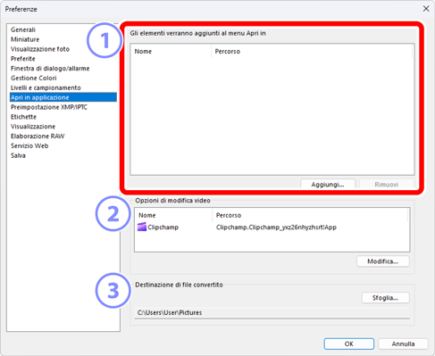 - Scegliere il software utilizzato per la modifica video. Il software incluso nel sistema operativo è impostato come predefinito. Fare clic su [Modifica] per selezionare il software che si utilizzerà per riprodurre o modificare i video. È possibile utilizzare una sola applicazione software alla volta.
