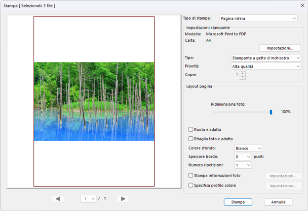- [Schermo intero]: stampare una sola immagine per pagina.