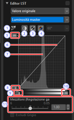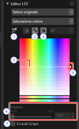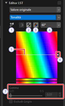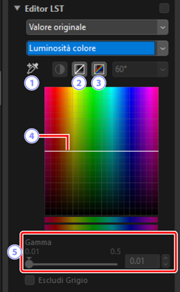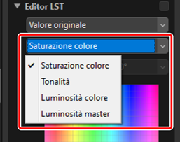 Effettuare regolazioni ai canali di luminosità, saturazione colore e tinta. Scegliere un canale utilizzando il menu nello strumento Editor LST. Le opzioni disponibili variano in base al canale selezionato. Lo strumento Editor LST non viene visualizzato quando [Regola utilizzando HDR] è attivato.