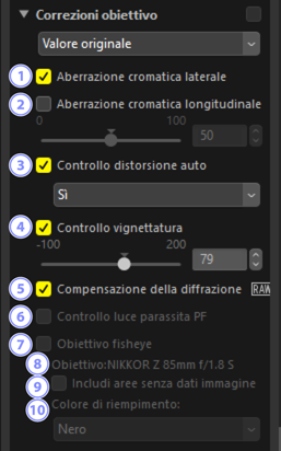 Selezionare questa opzione per utilizzare le informazioni sull'obiettivo registrate con le foto per ridurre la distorsione a barilotto associata a obiettivi grandangolo e la distorsione a cuscinetto associata ai teleobiettivi.