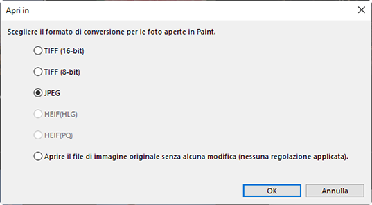 - [Aprire il file di immagine originale senza alcuna modifica (nessuna regolazione applicata)]: i file verranno aperti nei formati originali. I miglioramenti apportati in NX Studio non saranno applicati.