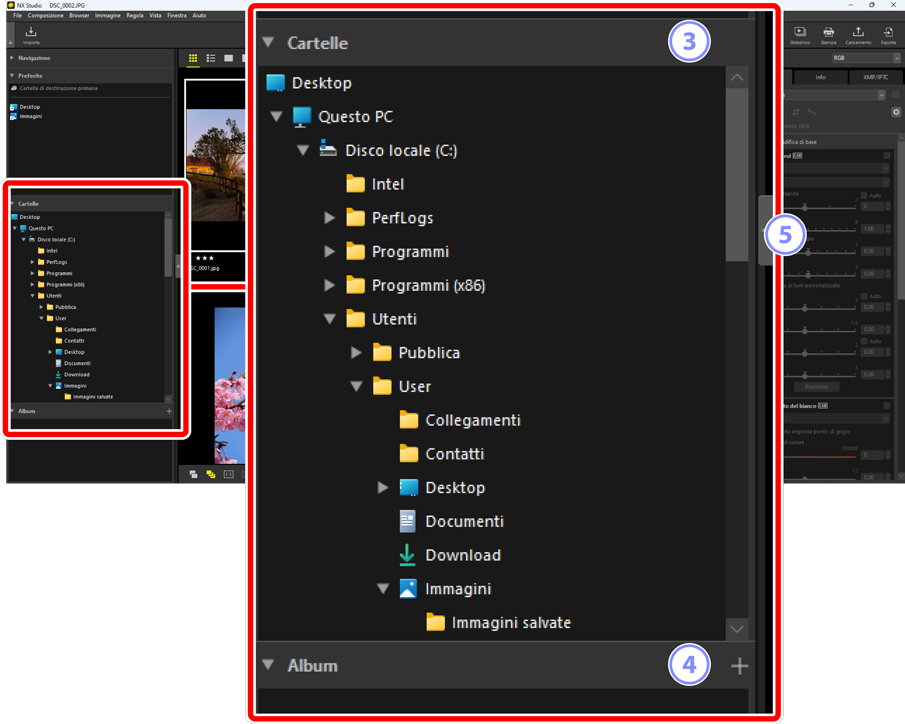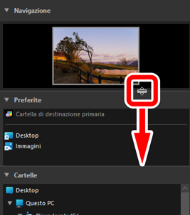 I riquadri secondari [Navigazione], [Preferite], [Cartelle] e [Album] possono essere visualizzati o nascosti facendo clic sui pulsanti