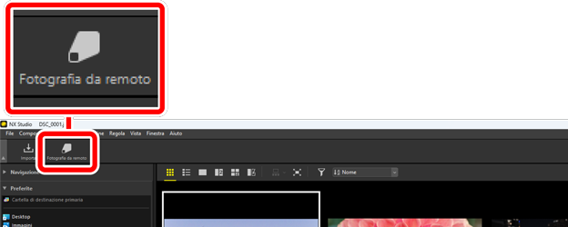 Se installato, NX Tether può essere avviato facendo clic su [Fotografia da remoto] nella barra degli strumenti.