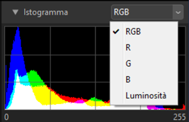 L'istogramma per l'immagine corrente. Per visualizzare o nascondere l'istogramma, fare clic sul pulsante