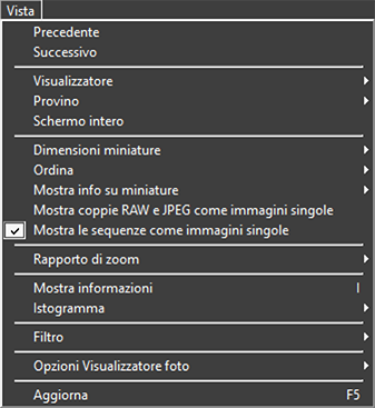 - Visualizzare ciascuna coppia di immagini scattate in formato RAW + JPEG o RAW + HEIF come un'unica immagine nelle viste miniature e pellicola.