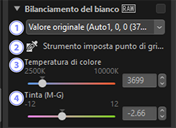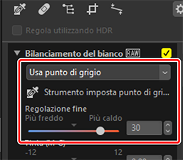 Regolare il bilanciamento del bianco. Si noti che questo strumento è disponibile solo con le immagini RAW e le immagini Pixel Shift fuse.