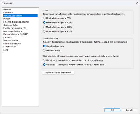 - [Scegliere la modalità di visualizzazione cui si accede facendo doppio clic sulle miniature]: scegliere se fare doppio clic su una miniatura nel reticolo miniature o nell'elenco miniature visualizza l'immagine a schermo intero o nel visualizzatore foto.