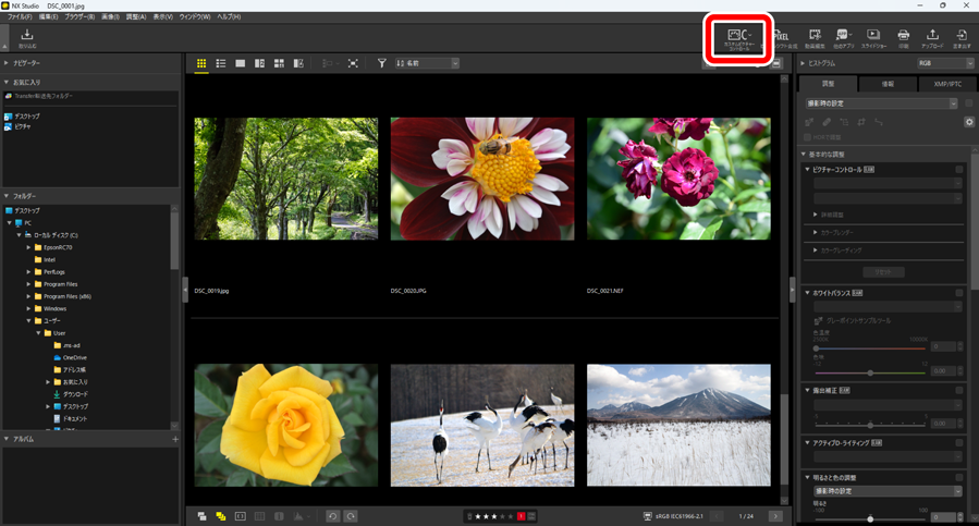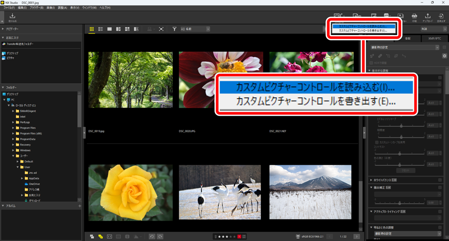 ツールバーの[カスタムピクチャーコントロール]ボタンをクリックすると、カメラやソフトウェアで書き出されたカスタムピクチャーコントロールファイルを読み込んでNX Studioに登録すること、およびNX Studioの画像調整パレットにある[ピクチャーコントロール]で登録したカスタムピクチャーコントロールをファイルに書き出すことができます。