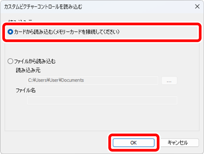 表示される[カスタムピクチャーコントロールを読み込む]ダイアログで[カードから読み込む(メモリーカードを接続してください)]を選び、[OK]をクリックします。