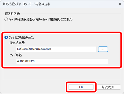 表示される[カスタムピクチャーコントロールを読み込む]ダイアログで[ファイルから読み込む]を選び、読み込むファイルを選んで[OK]をクリックします。
