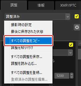 調整タブの調整リストを使用すると調整内容をコピー/保存/登録して他の画像に適用できます。複数の調整内容をまとめて適用することも可能です(0調整した内容を複数の画像に適用する)。