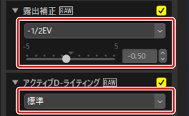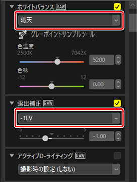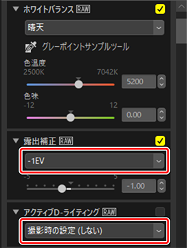調整が適用されます。すでに設定していた[露出補正]が手順1と同じ値に変更され、[アクティブD-ライティング]の設定は[撮影時の設定(しない)]に戻っています。