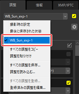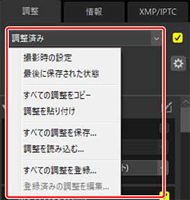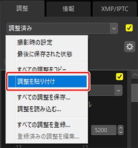 NX Studioでは、調整内容を他の画像に適用できます。他の画像に適用するには、各調整項目にある調整設定メニューを使用する方法と、調整タブにある調整リストを使用する方法があります。