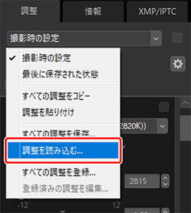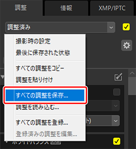 すべての調整内容を設定ファイルとして保存するには[すべての調整を保存]を選びます。保存した設定ファイルは、[調整を読み込む]で読み込んで画像に適用できます。設定ファイルを他のパソコンにコピーすれば、他の環境でも同じ調整を簡単に適用できます。