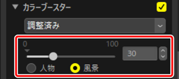 画像調整パレットで調整を行います。ここでは調整対象で[風景]を選び、調整値を+30にしています。