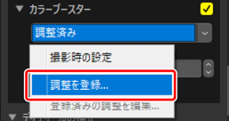 調整内容を画像調整パレットの調整設定メニューにプリセットとして登録できます。登録したプリセットを選ぶと、他の画像に同じ調整内容が適用されます。ここでは[カラーブースター]を例にしています。