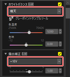画像の調整を行います。ここでは[ホワイトバランス]を[晴天]に、[露出補正]を[+1EV]に設定しています。