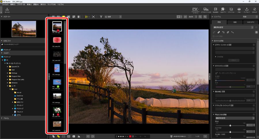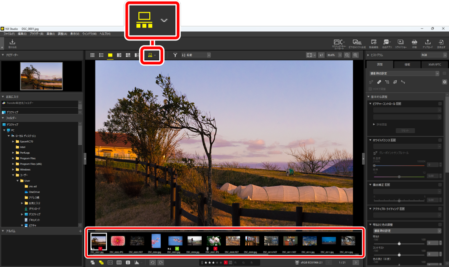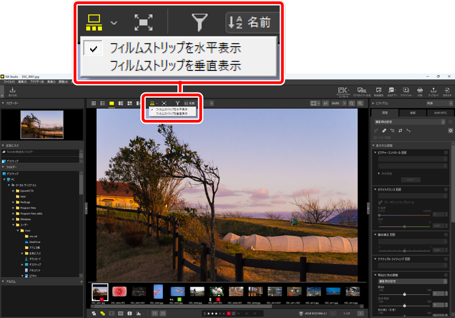 )にするとビューアーの下または左一列にサムネイル(フィルムストリップ)が表示されます。