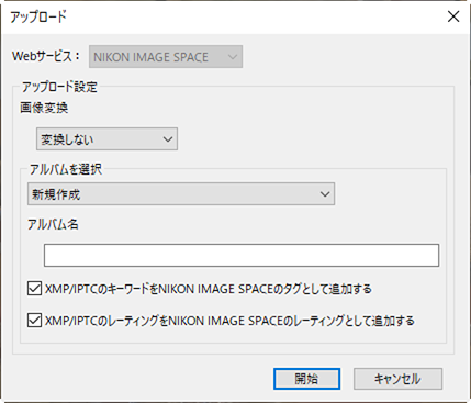 - [XMP/IPTCのレーティングをNIKON IMAGE SPACEのレーティングとして追加する]:チェックを入れると、画像に設定しているレーティングを付けてアップロードできます( 0レーティングを付ける)。