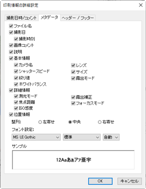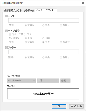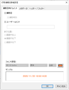 印刷情報設定ダイアログの[撮影日時/コメント]タブ、[メタデータ]タブ、[ヘッダー/フッター]タブで印刷する撮影情報を設定します。