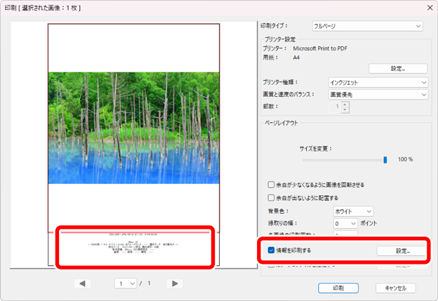 [情報を印刷する]にチェックを入れると、ファイル名や撮影日時、撮影情報などを画像の下に印刷できます。[設定]ボタンをクリックして印刷情報の設定を行います。