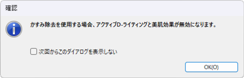 [かすみ除去]を有効にすると、[アクティブD-ライティング]と[美肌効果]は無効になります。