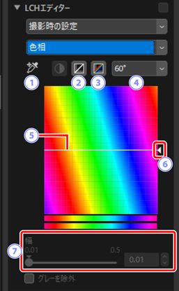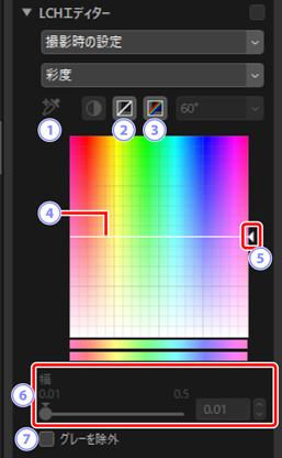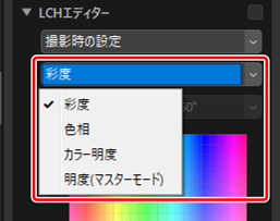 画像の明るさやカラー明度などのチャンネルを切り換えて、個別に調整できます。LCHエディターでは、チャンネルセレクターで調整するチャンネルを選択します。選んだチャンネルによって、調整パレットの内容が切り替わります。[HDRで調整]がオンの場合は表示されません。