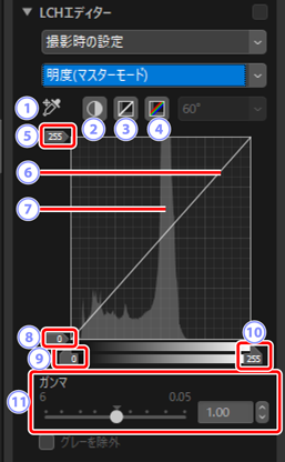 - それぞれの入力明度で表示されている画素の分布を表示します。横軸が明度(0~255)で、縦軸が画素数を示します。