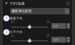 遠近感による被写体のゆがみを垂直方向および水平方向に–20から20までの範囲で調整できます。