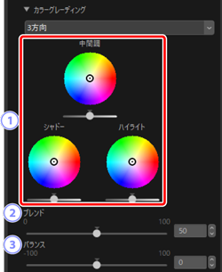 - [バランス]の値は[ハイライト]、[中間調]、[シャドー]、[3方向]での共通値です。たとえば[ハイライト]で値を調整すると、[中間調]、[シャドー]、[3方向]でも同じ値になります。