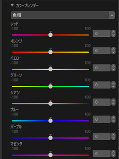 色ごとの色相を調整できます。[カラー]で[色相]を調整している場合、その調整結果も反映されています。