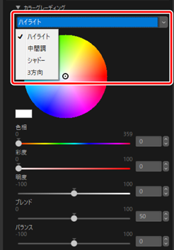 画像内のハイライト部、中間調部、シャドー部の各領域を[⾊相]、[彩度]で調整した色味にしたり、[明度]で明るさを調整したりできます。カラーホイールを使用して、直感的に色を選ぶことが可能です。