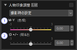 色相と明るさの設定を調整します。D6、D850、D780、およびニコンZ シリーズのカメラで撮影したRAW画像またはピクセルシフト合成画像のみ調整可能です。