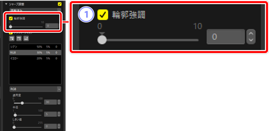 - シャープネスの強度を設定します。数値を大きくするほどシャープが強くかかり、濃いエッジがかかります。