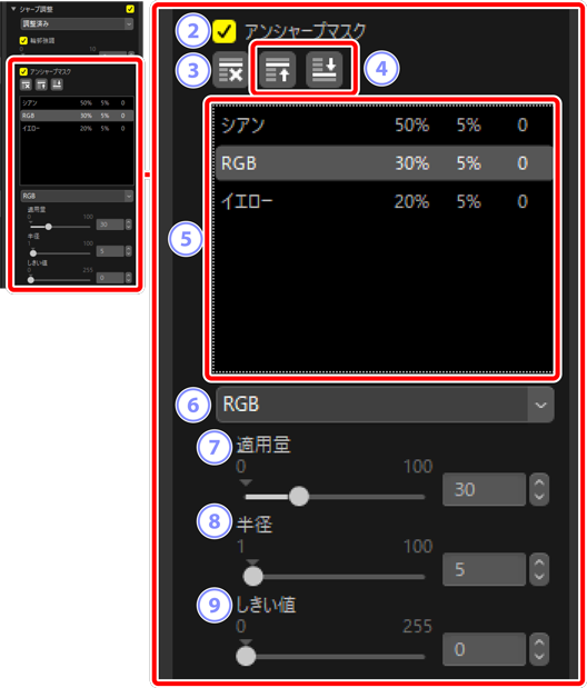 - チェックを入れるとアンシャープマスク機能を有効にします。